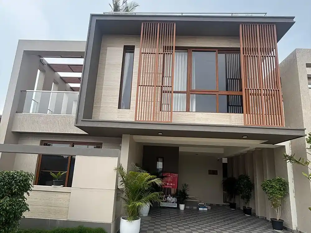 Three-track UPVC shutters/aluminum windows with clear glass | Main door – teak wood frame with designer flush door shutter