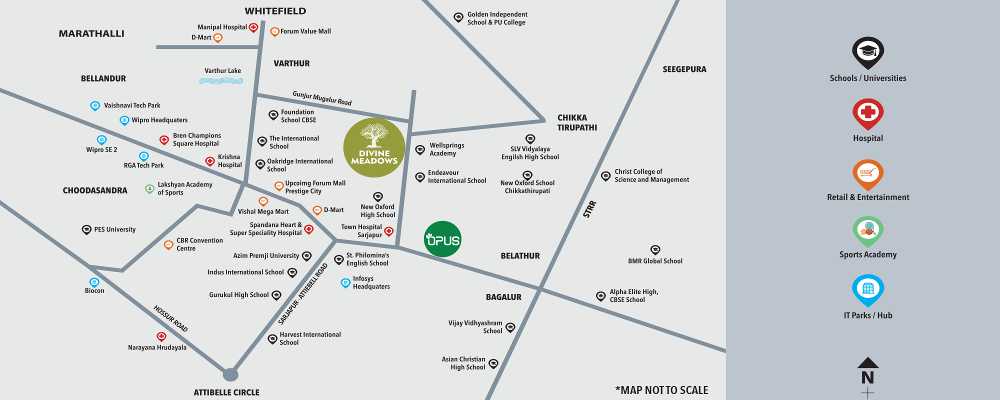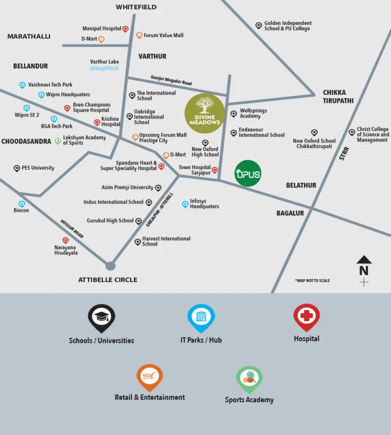 Genurise Divine Meadows is located at Chikka Tirupati Road, Sarjapur Road, Bengaluru, with excellent connectivity to IT hubs, educational institutions, healthcare facilities, and key city destinations.